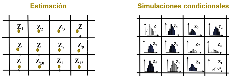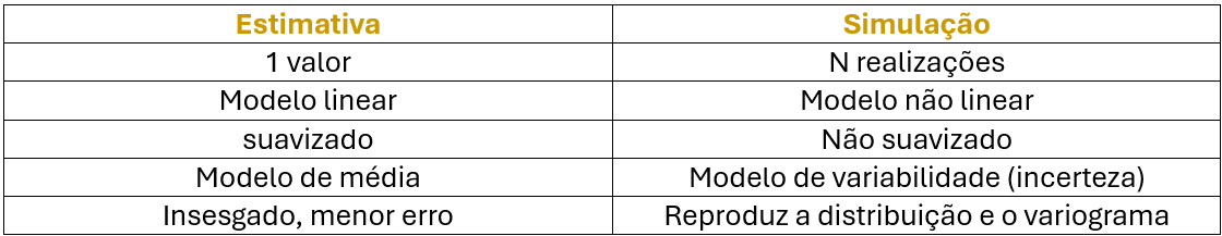 Como mencionado, as estimativas entregam um único valor em cada bloco do modelo, enquanto que as simulações, ao serem N modelos, entregam uma distribuição de valores para cada bloco (Figura 2).