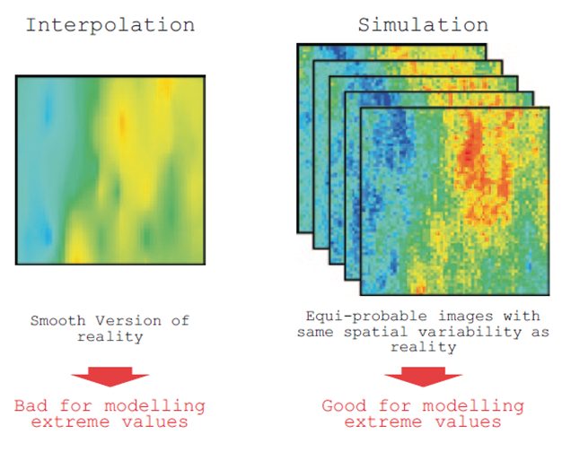 As simulações, por outro lado, são modelos não lineares, reproduzem a variabilidade dos dados, o que implica que preservam os valores extremos (não suavizam). As simulações produzem um conjunto de valores para cada ponto, permitindo quantificar a incerteza. Elas reproduzem corretamente a proporção de valores altos e baixos.