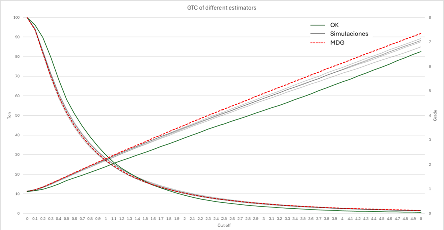 Se utilizarmos o modelo de discreto gaussiano como referência, podemos observar a diferença entre um modelo estimado por kriging e um modelo simulado em termos de curva tonelagem-teor: o kriging, ao suavizar, reporta mais tonelagem de baixa lei e menos tonelagem de alta lei, enquanto que as simulações não têm essas divergências. Da mesma forma, o kriging sempre reporta uma menor lei média a corte maior que zero (sendo insesgado somente a lei de corte 0), em contraste com as simulações condicionais. Para essa comparação, as simulações pontuais foram promediadas ao suporte de SMU, igual ao do kriging.