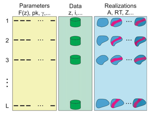 Quando possível, recomenda-se quantificar a variabilidade em cada etapa do estudo de recursos, seguindo um fluxo de trabalho hierárquico e uma configuração de uma-a-uma realização. A Figura 4 mostra de forma esquemática a integração da incerteza nas diferentes etapas do modelo, seguindo a configuração uma-a-uma e transferindo a incerteza em cada etapa (Deutsch, 2018; Deutsch, 2021).