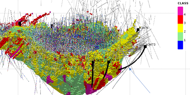 A partir das simulações condicionais, foi calculada a variável entropía, que resume a incerteza do modelo geológico. A partir desta medida, é possível definir zonas em que o modelo é mais incerto e que, portanto, requer uma maior quantidade de informação (sondagens) para ser corretamente caracterizado (Figura 5). Isso pode ajudar no planejamento de novas perfurações (Figura 6) ou conduzir medidas de mitigação, como a mistura de materiais e ajustes no plano de mina para evitar frentes com alta entropia.