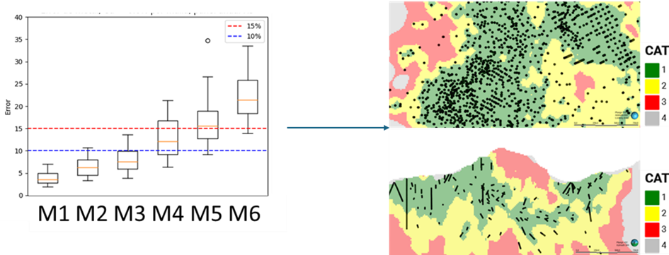 Com base em um estudo de simulação, amostragem artificial e re-simulação, é possível quantificar a relação entre o espaçamento de sondagens e a incerteza — isto é, medir quanto a variabilidade do depósito diminuirá com a chegada de novas informações. Relacionando isso com um erro tolerado e um nível de confiança, podemos definir as malhas de sondagens necessárias para as categorias medido e indicado. A vantagem desse estudo sobre outras ferramentas de categorização é que a incerteza é medida diretamente e integra tanto a variabilidade da geologia quanto dos teores, além de permitir medir o erro em relação a uma lei de corte.