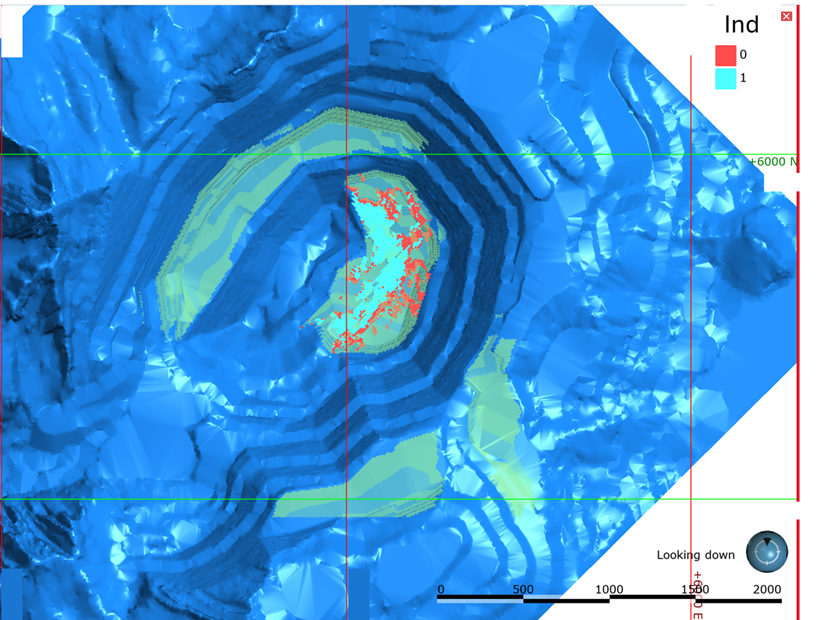 A partir do modelo simulado, gerou-se um indicador de confiança de 90 % de ser rocha mineralizada e de ultrapassar a lei de corte operacional. Esse indicador foi cruzado com o modelo de recursos oficial e identificou blocos que, no modelo determinístico, eram considerados rocha mineralizada e acima da lei de corte, mas que as simulações mostraram baixa probabilidade de realmente serem assim. Ao revisar esse indicador com reconciliations, observou-se correlação com resultados deficientes do modelo oficial. Dessa forma, o indicador foi utilizado pela equipe de curto prazo para identificar fases e bancadas com alta probabilidade de erro (blocos em vermelho na Figura 8).